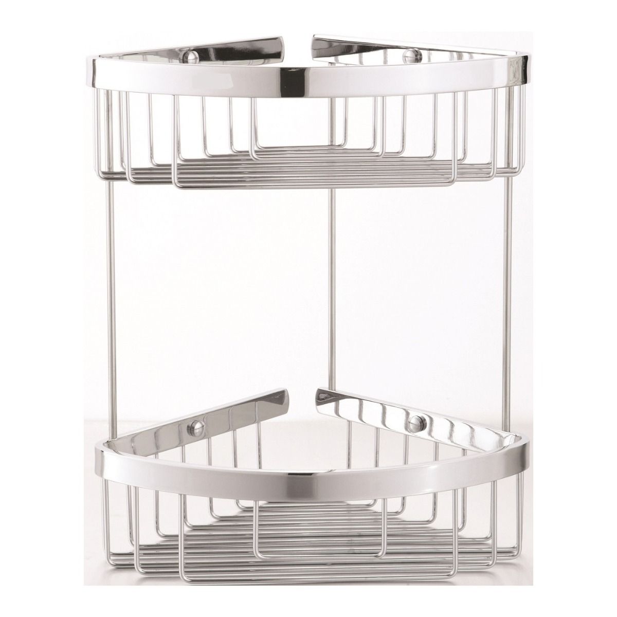 Fraaie dubbele zeephouder RVS 304 verchroomd, zwaar uitgevoerd met afdekdoppen voor de montage schroeven. Maatvoering 225x225x345mm (bxdxh). Hoogte dubbele zeepkorf 8cm.