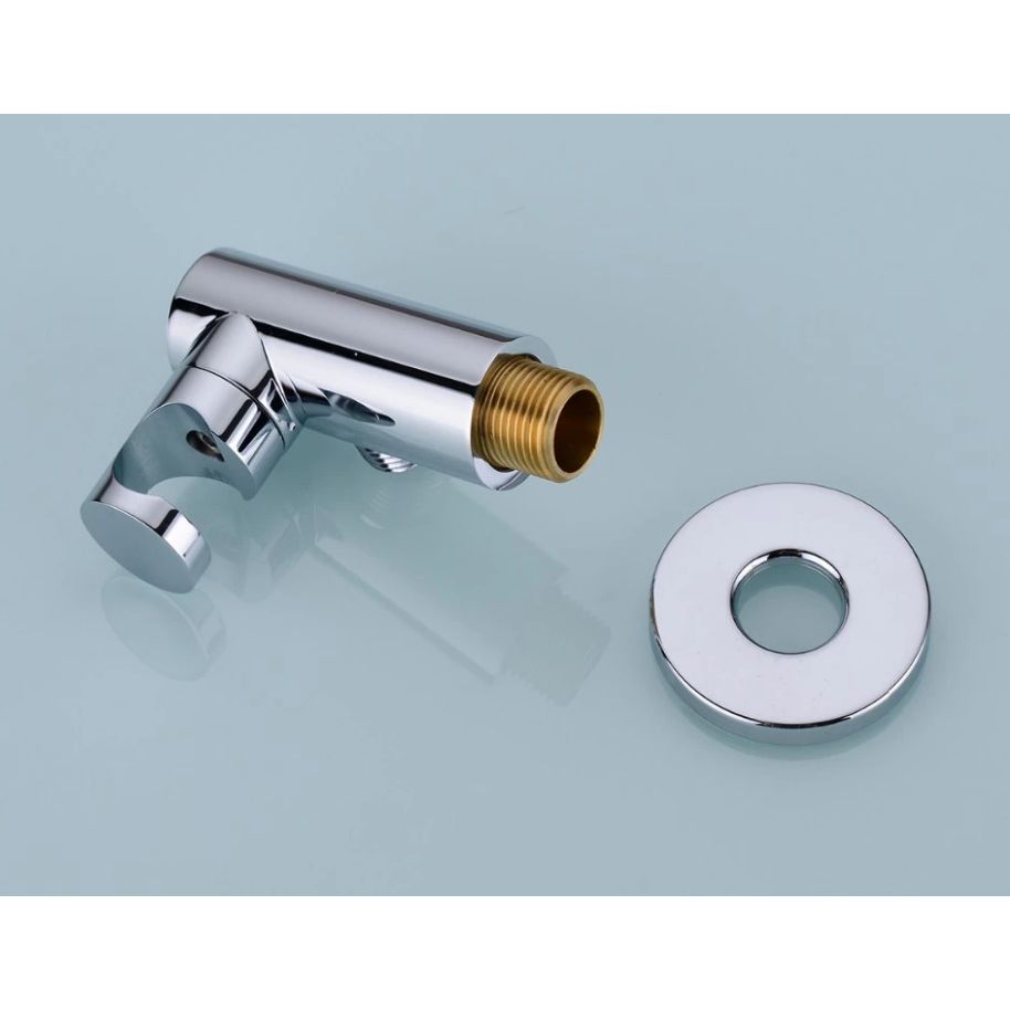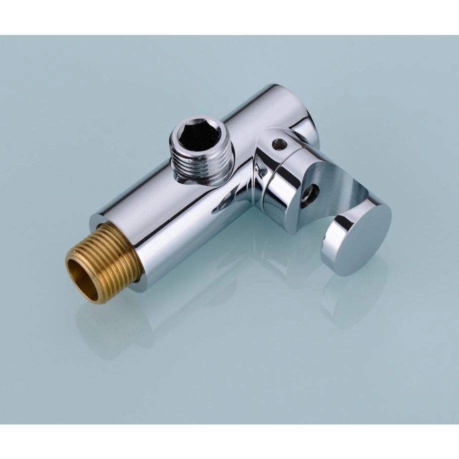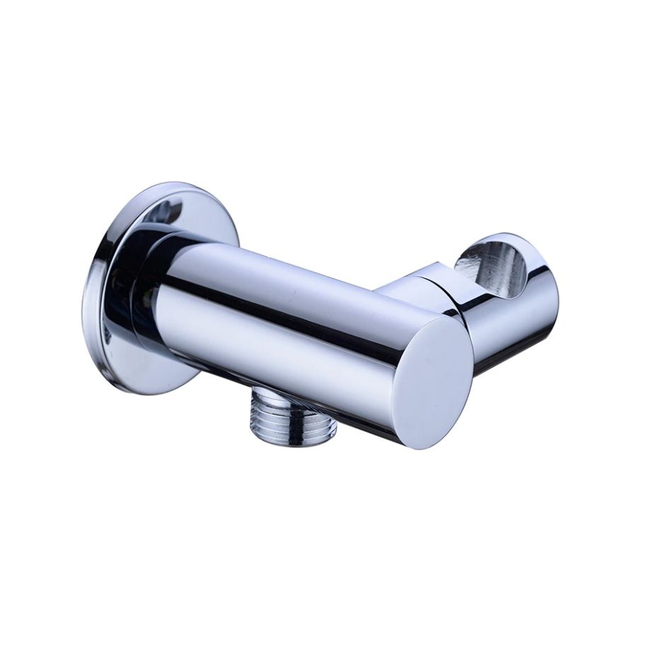 Handdouchehouder van Messing met muuraansluiting ½" chroom en waterinlaat, aansluiting voor een doucheslang en geïntegreerde houder voor een handdouche. Te gebruiken in combinatie met een (thermostatische) inbouwkraan.