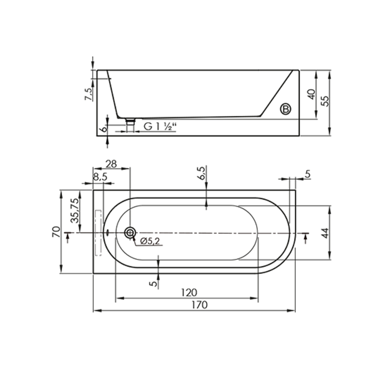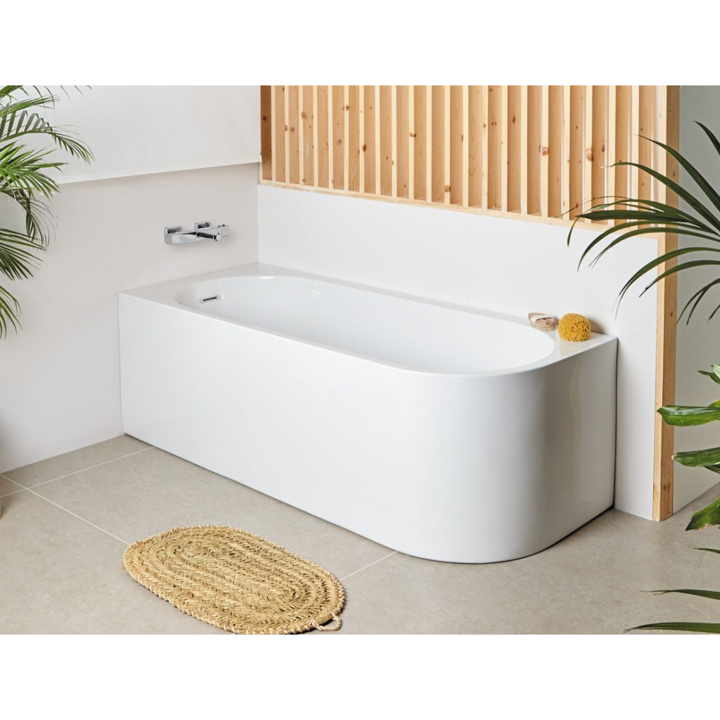Design hoekbad 170x70cm, hoogte 55 cm, van acryl, kleur wit. Inclusief witte afvoerplug voorzien van push open-dicht mechanisme en verchroomde geïntegreerde overloop. Het ligbad heeft een maximale inhoud van 182 liter en is voorzien van een hoek aan de linker kant.