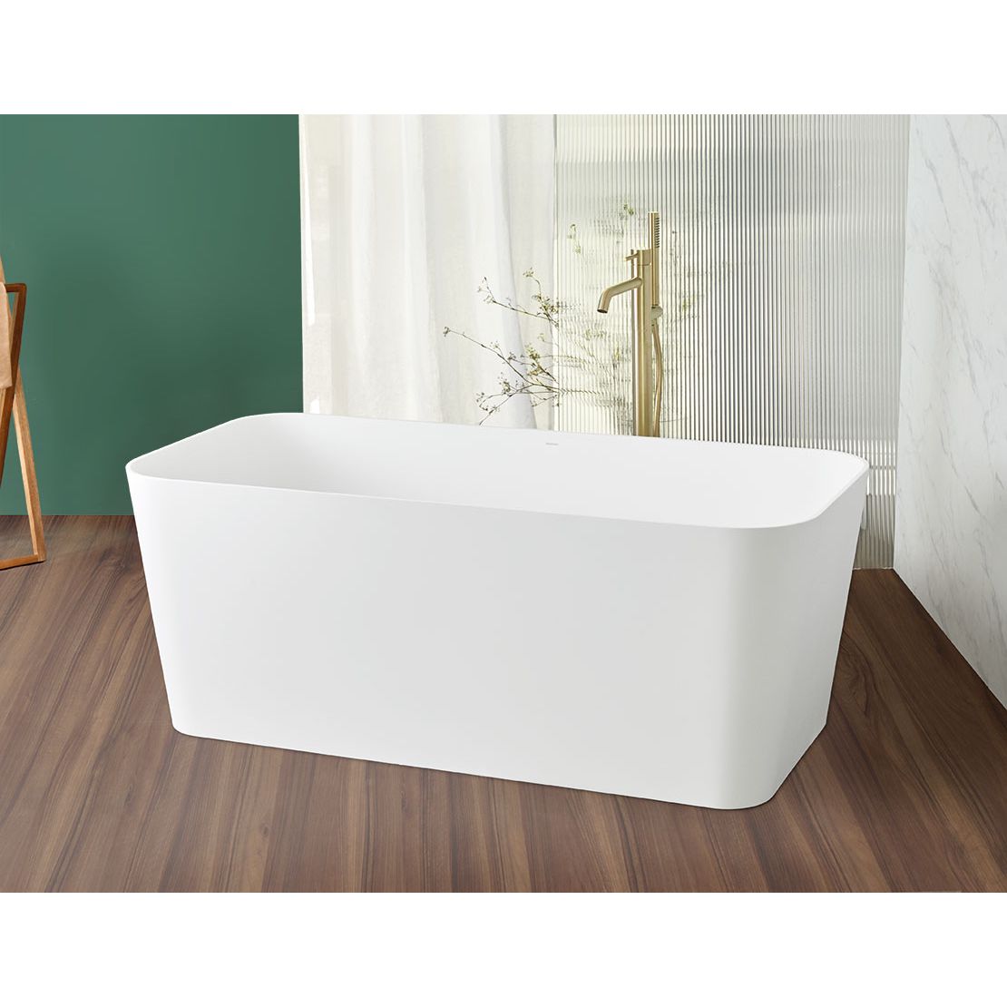 Vrijstaand design bad 150x70cm, hoogte 55cm, van Solid Surface, kleur mat wit. Dit bad wordt geleverd inclusief een flexibele afvoerbuis en een afvoerplug van Solid Surface mat wit welke is voorzien van een push open-dicht mechanisme. Het ligbad heeft een maximale inhoudt van 266 liter met.