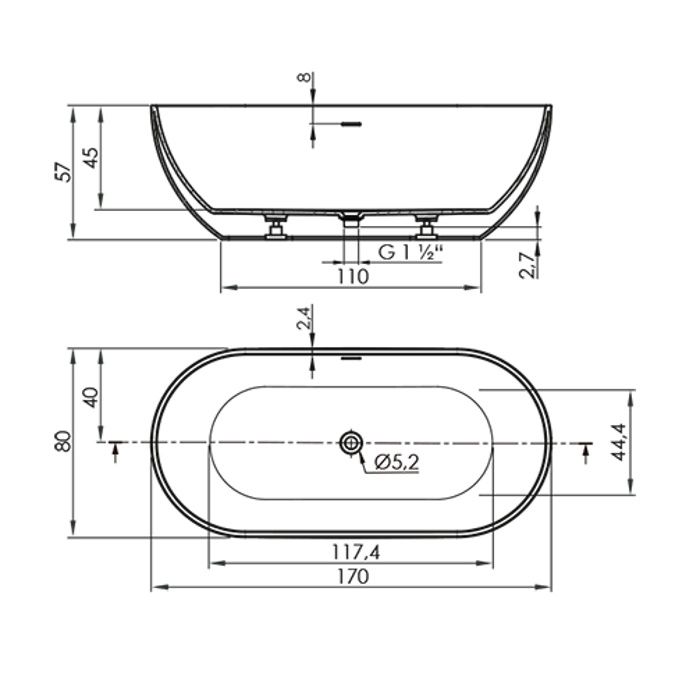 Vrijstaand design bad 170x80cm, hoogte 57cm, van composiet, kleur mat wit. Dit bad wordt geleverd inclusief een een afvoerplug mat wit welke is voorzien van een push open-dicht mechanisme. Het ligbad heeft een maximale inhoudt van 278 liter.