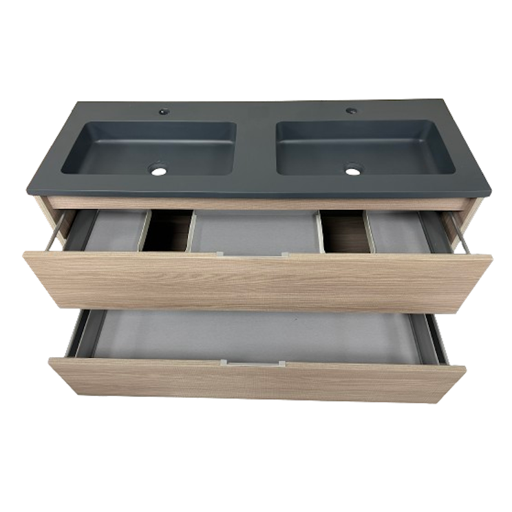 Badmeubel Kalipso Frenso Estepa. Afmetingen 119x45,5x56cm (bxdxh), met 2 Sofclose lades waarvan de bovenste lade is voorzien van een uitsparing voor een sifon. Inclusief dubbele composiet wastafel in antraciet RAL 7016, met een dikte van 2 cm. Voorzien van geïntegreerde waskommen en kraangaten.