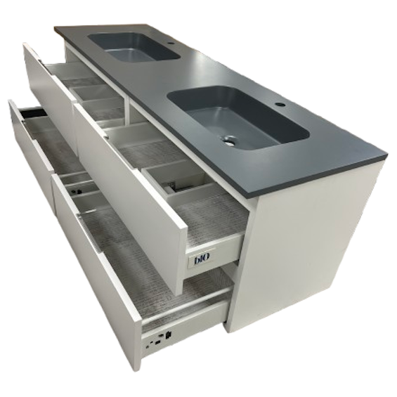 Dubbel badmeubel Life Mat Wit. Afmetingen 149x43x50cm (bxdxh), met 4 Sofclose lades waarvan de bovenste lades voorzien zijn van een uitsparing voor een sifon. Inclusief Composiet wastafel Bazaltgrijs RAL7012 met een dikte van 2cm en met 2 geïntegreerde waskommen en kraangaten.