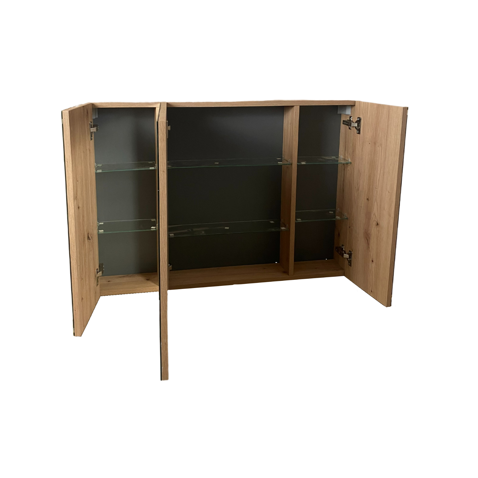 Hangende spiegelkast in de kleur modern eiken met een elegante look. Afmetingen 100x14,5x70cm (bxdxh). Verder wordt deze spiegelkast geleverd met twee glazen legplanken voor al uw badkamerspullen. Dankzij de handige scharnieren, die aan de kastdeuren gemonteerd zijn, kunt u de deuren gemakkelijk uit de spiegelkast klikken. Aan de onderzijde van de kast bevindt zich een klein handvat waarmee u de kast kunt openen.