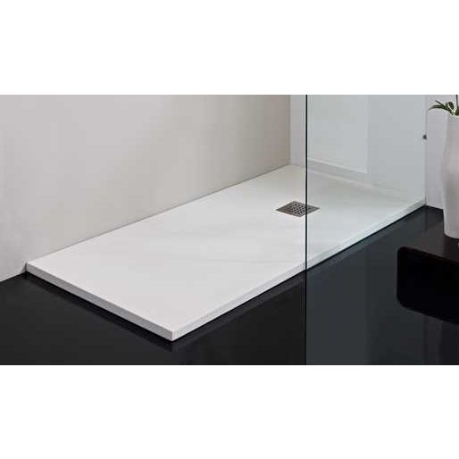 Platte douchebak op maat Plano is gemaakt van composietsteen en slechts 2,5 á 3cm hoog. Leverbaar in 9 kleuren en optioneel in RAL- of NCS-kleur naar keuze, afwerking egaal of Granito. Inclusief sifon, standaard voorzien van afschot.