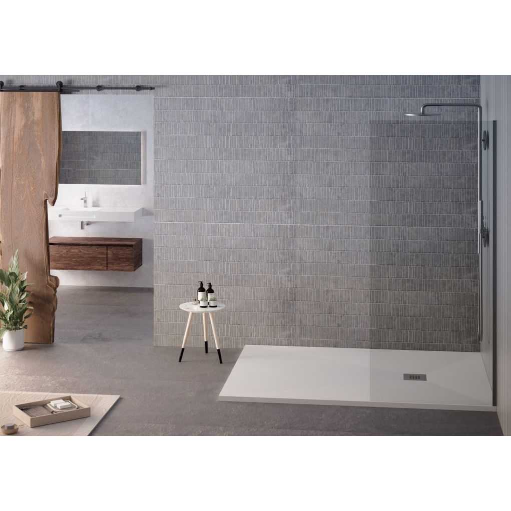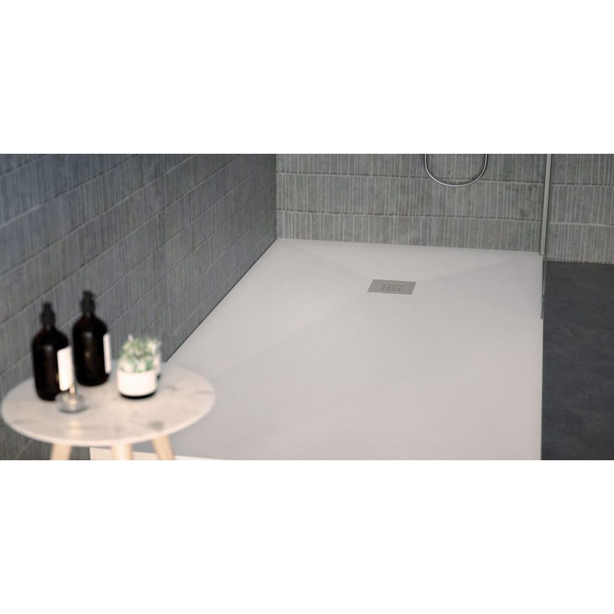 Platte douchebak op maat Soft is gemaakt van composietsteen en slechts 2,5 tot 3 cm hoog. Leverbaar in 12 standaardkleuren en iedere RAL-kleur naar keuze. Inclusief vierkant RVS afvoerrooster, sifon met zeefje en voorzien van afschot.
