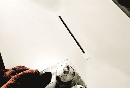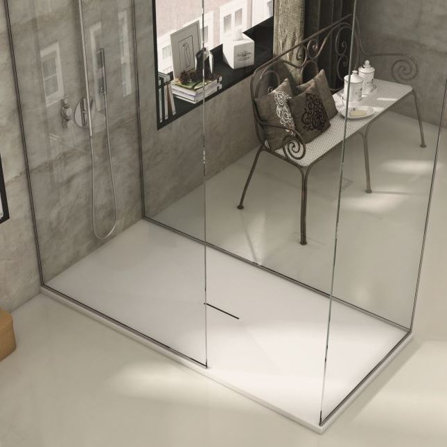 Platte douchebak op maat Hydra van Solid Surface heeft een centraal geplaatste afvoer is slechts 3cm hoog. Leverbaar in wit, afwerking glad (egaal). Inclusief centrale geïntegreerde afvoer en sifon, standaard voorzien van afschot.