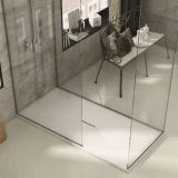 Platte douchebak op maat Hydra Eco van Solid Surface heeft een centraal geplaatste afvoer is slechts 3cm hoog. Leverbaar in wit, afwerking glad (egaal). Inclusief centrale geïntegreerde afvoer en sifon, standaard voorzien van afschot.