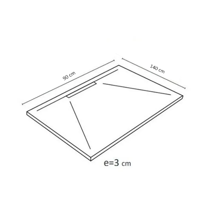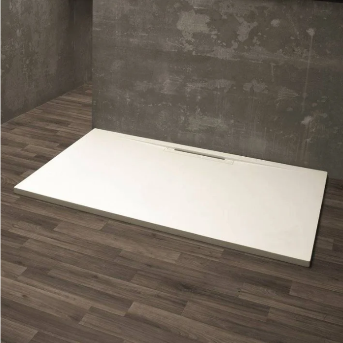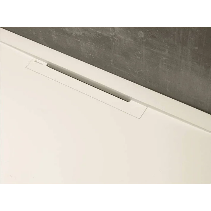 Platte douchebak op maat Hydra Frontal van Solid Surface is slechts 3cm hoog. Leverbaar in wit, afwerking glad (egaal). Inclusief centrale geïntegreerde afvoer en sifon, standaard voorzien van afschot.