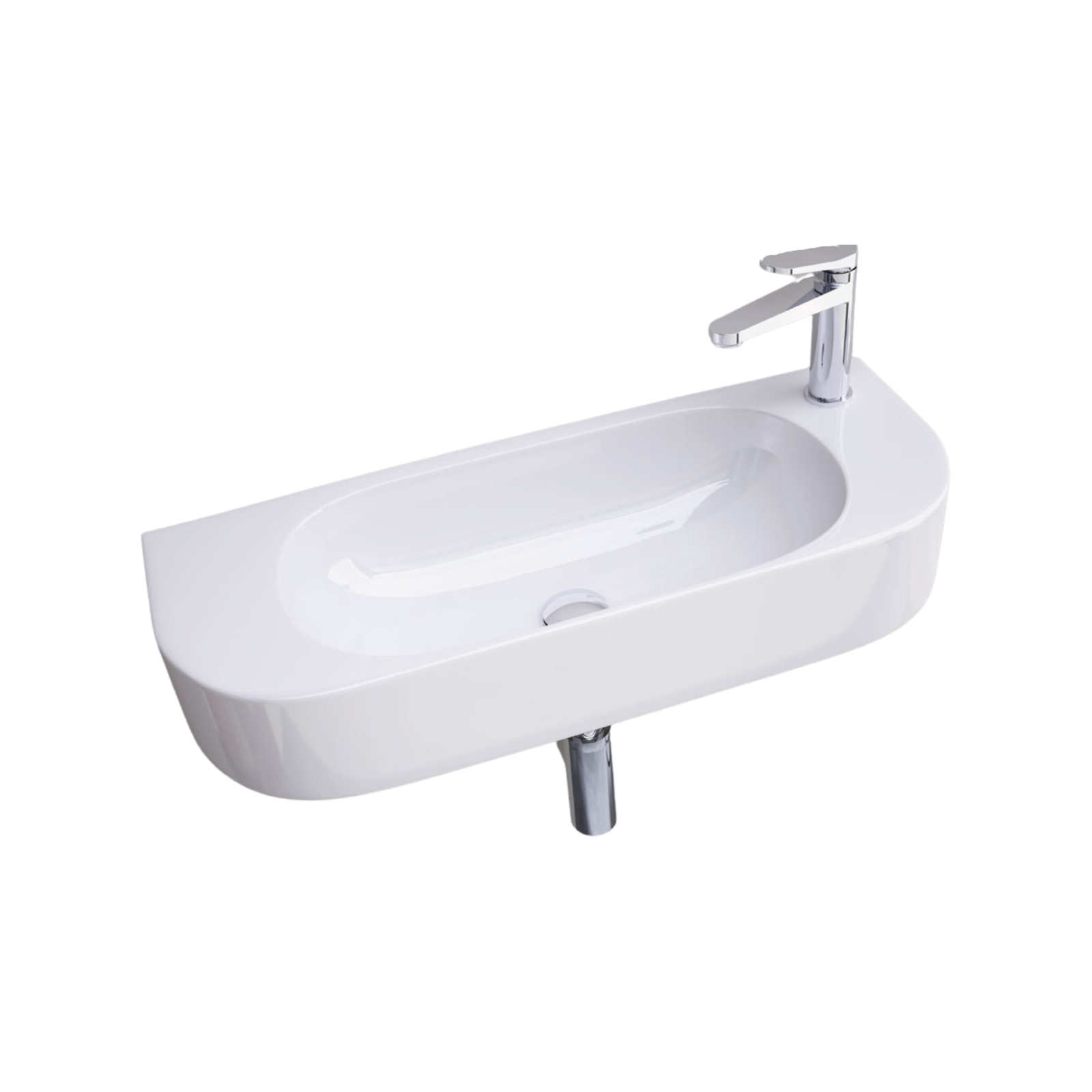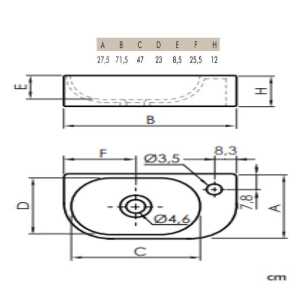 Keramisch fontein Petit 71.5x27.5cm wit glans, hoogte 12cm. Voorzien van kraangat en standaard afvoergat diameter 46mm. Zowel hangend aan de muur als als opzet waskom te monteren, ideaal voor kleinere toiletruimte's.