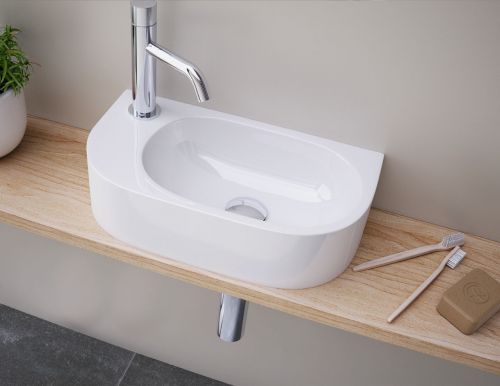 Keramisch fontein Petit 40x22cm wit glans, hoogte 11cm. Voorzien van kraangat en standaard afvoergat diameter 46mm. Zowel hangend aan de muur als als opzet waskom te monteren, ideaal voor de kleinere toiletruimte's.