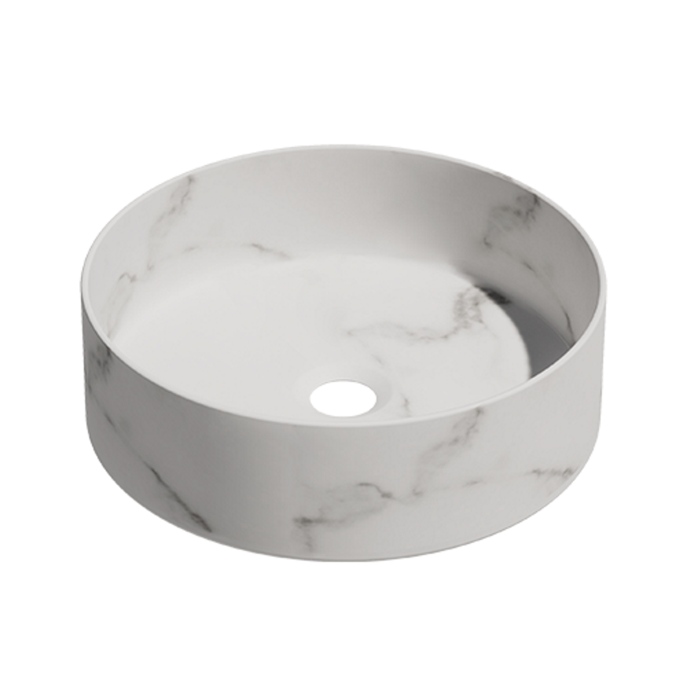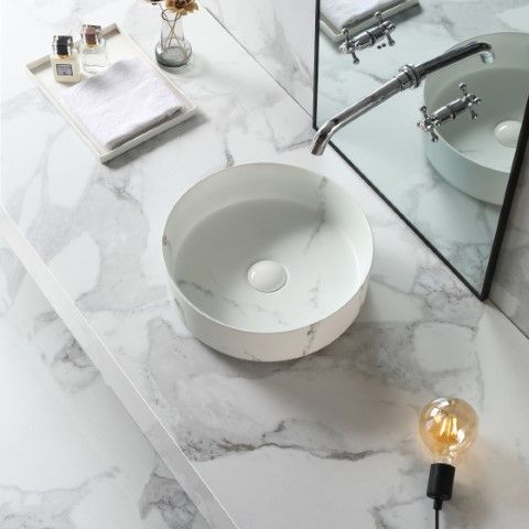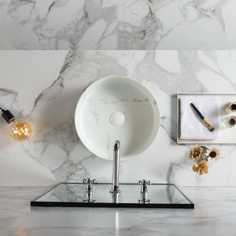 Keramische ronde opbouw waskom Calacatta ø36cm wit marmer met grijze ader, hoogte 12cm. Voorzien van standaard afvoergat diameter 46mm.
