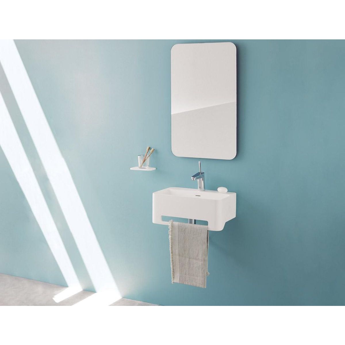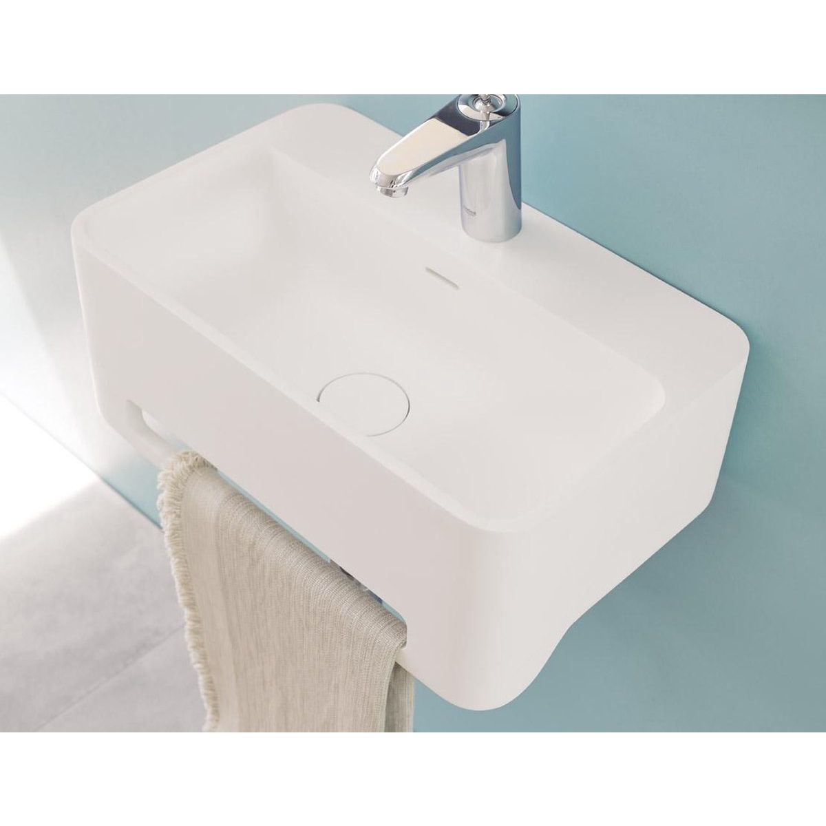 Wastafel hangend York 50x31x20cm (bxdxh) mat wit met kraangat, afvoerplug Up&Down van Solid Surface en geïntegreerde handdoekhouder. Levering inclusief montageset voor montage aan de muur.